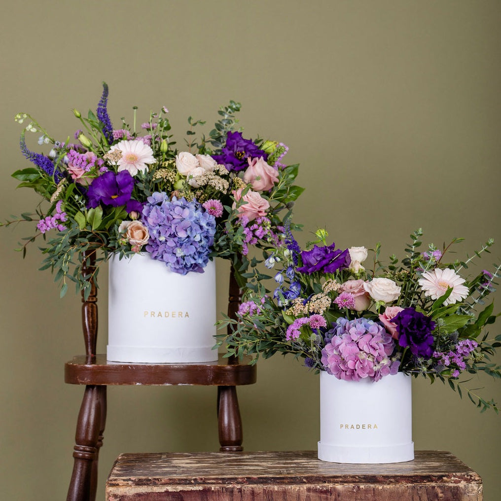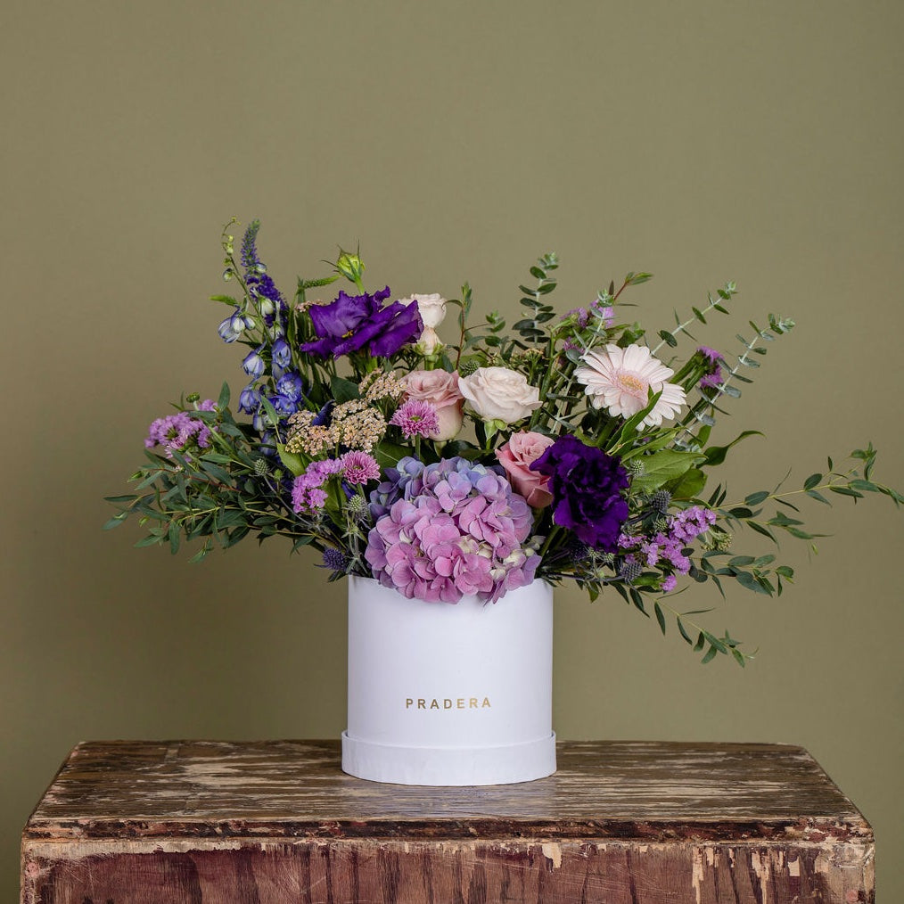 Caja Pradera con flores en tonos lilas — Las flores pueden variar y las fotos solo sirven de ejemplo, te garantizamos que estará hecho con las flores mas frescas y bellas del mercado.