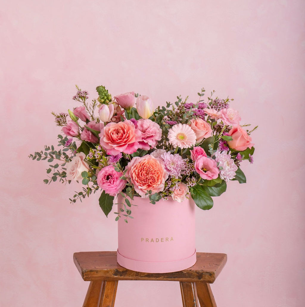 Caja Pradera rosa con flores en tonos rosas — Las flores pueden variar y las fotos solo sirven de ejemplo, te garantizamos que estará hecho con las flores mas frescas y bellas del mercado.