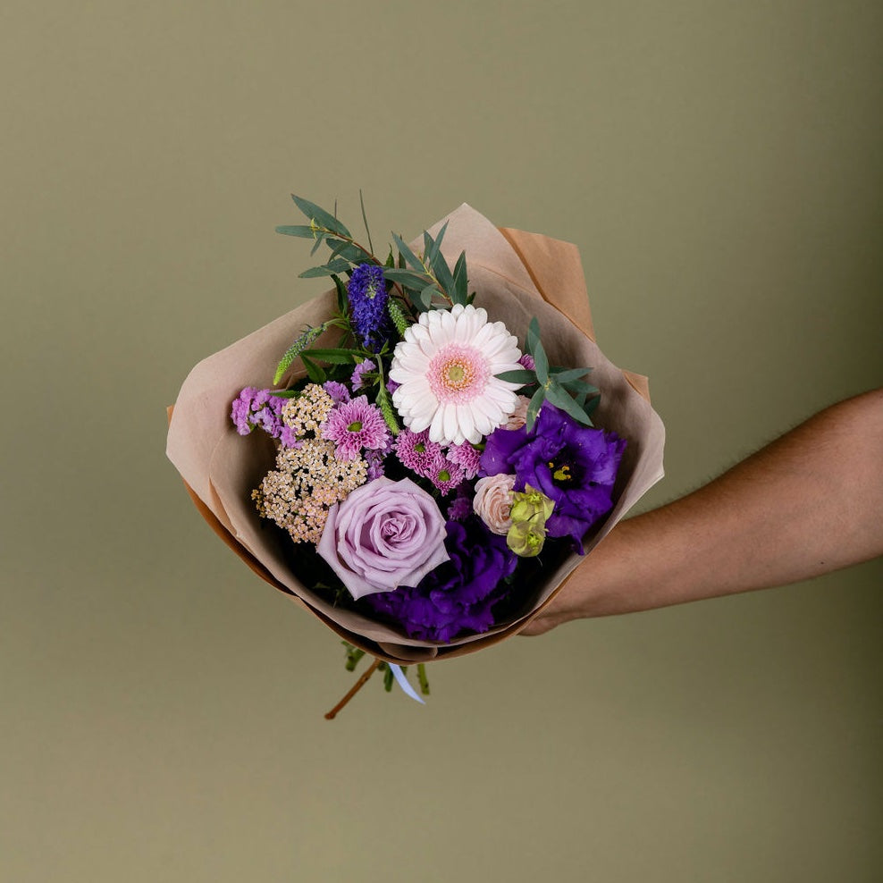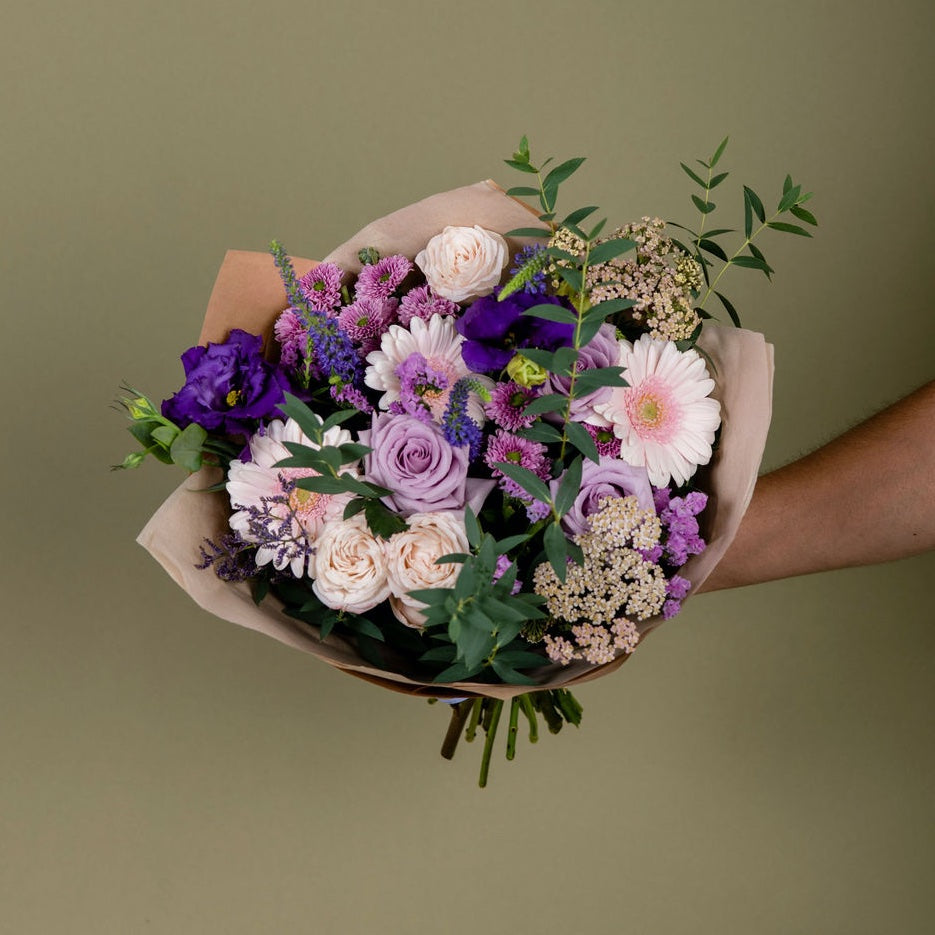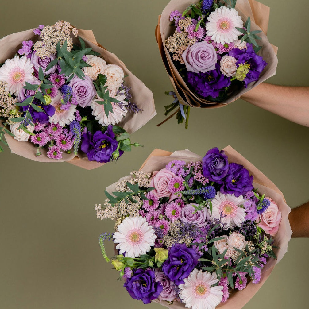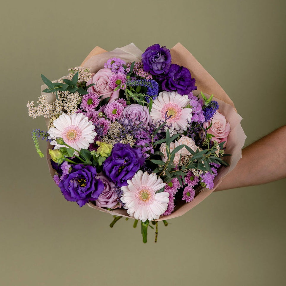 Ramo en tonos lilas — Las flores pueden variar y las fotos solo sirven de ejemplo, te garantizamos que estará hecho con las flores mas frescas y bellas del mercado.