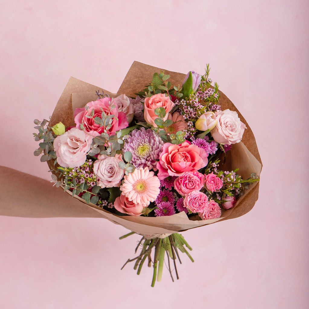Ramo en tonos rosas — Las flores pueden variar y las fotos solo sirven de ejemplo, te garantizamos que estará hecho con las flores mas frescas y bellas del mercado.
